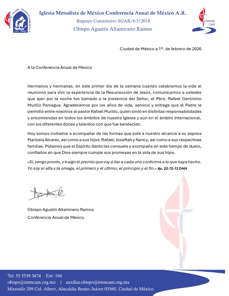 El pasado 31 de enero de 2026 fue llamado a la presencia del Señor el presbítero Rafael Gerónimo Murillo Paniagua, miembro de la Conferencia Anual de México.