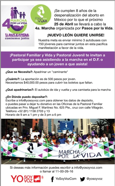 Este evento, ya concluido, involucró principalmente a jóvenes católicos de la región norteña de México, en el Estado de Nuevo León,pero a la vez formando parte de una movilización más grande. Nos parece una iniciativa loable puesto que encauzó de una manera constructiva y proactiva la celebración de la Cuaresma, de tal grado que podría motivarnos a los evangélicos como ejemplo de expresión en pro del reino de Cristo en nuestra sociedad. Esta lucha en favor del respeto a la vida humana, por ser parte fundamental de la creación de Dios, nos hace reconocer asuntos de concordancia, intereses en común, con los militantes de otras confesiones cristianas