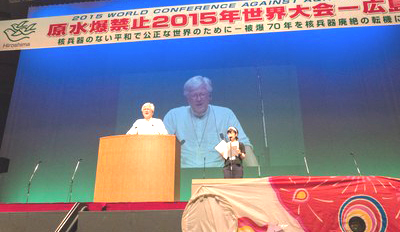 El obispo Dr. Heinrich Bedford-Strohm, presidente del Consejo de la Iglesia Evangélica de Alemania y uno de los líderes religiosos que están haciendo una peregrinación en Japón con ocasión del 70º aniversario de los bombardeos atómicos, defendió el Compromiso humanitario contra las armas nucleares en la concentración del Día de Hiroshima, el 8 de agosto de 2015.