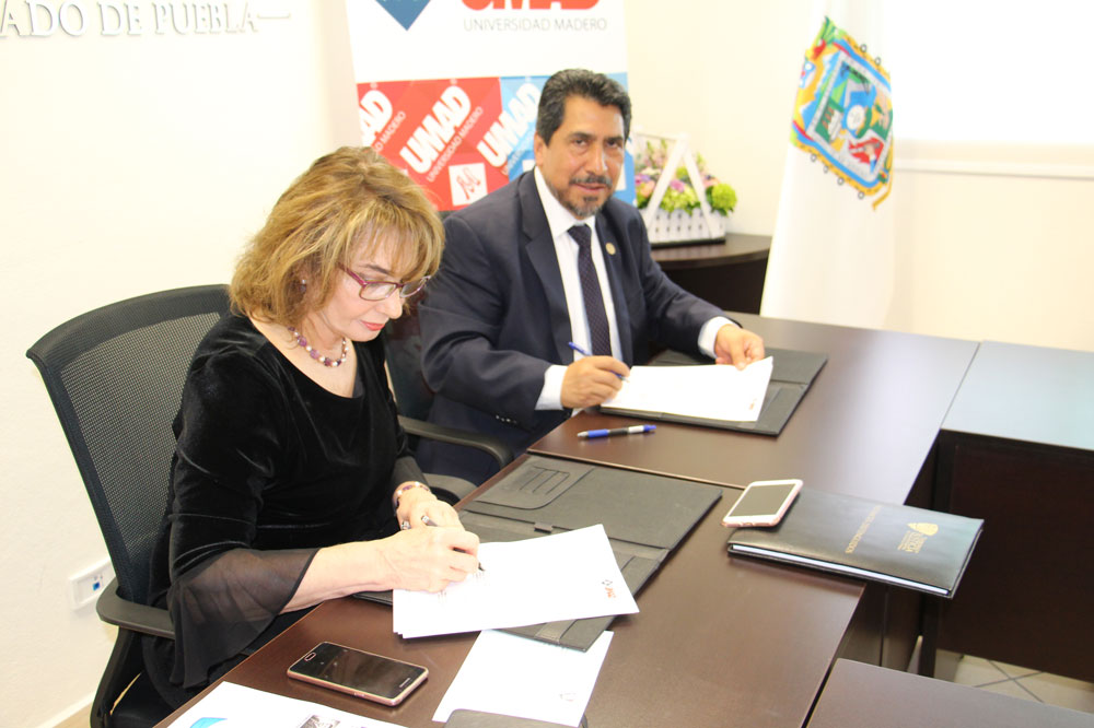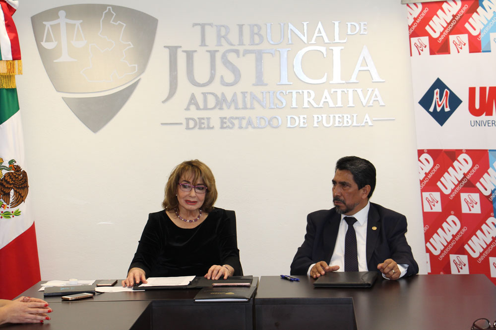 Puebla, Puebla.-Ante las y los Magistrados del pleno del Tribunal de Justicia Administrativadel Estado de Puebla, Luz María Aguirre Barbosa, María Esther TorreblancaCortes, Alfonso Siriako Guillén Almaguer, David Paz Moreno, Rubén José HuertaYedra y Gilberto Suárez Machado, el Rector de la Universidad Madero de Puebla,Mtro. Job César Romero Reyes y la Magistrada Presidenta del Tribunal, María deLourdes Dib y Álvarez, firmaron un convenio de colaboración, con objetivoscomunes y complementarios en diversas áreas y competencias relacionadas con lainvestigación, desarrollo y formación jurídica avanzada.