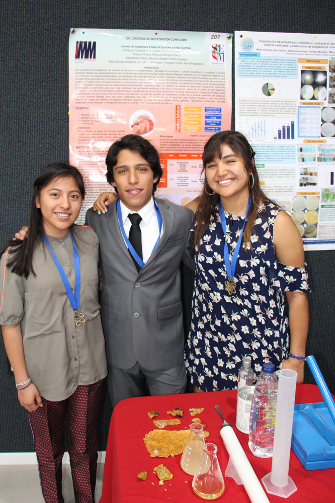 “Lámina bioplástica a base de camote”, realizado por Blanca Cuaya, César Flores y Ana Gabriela Rodríguez; asesorados por la Profa. Marisol Mendoza.