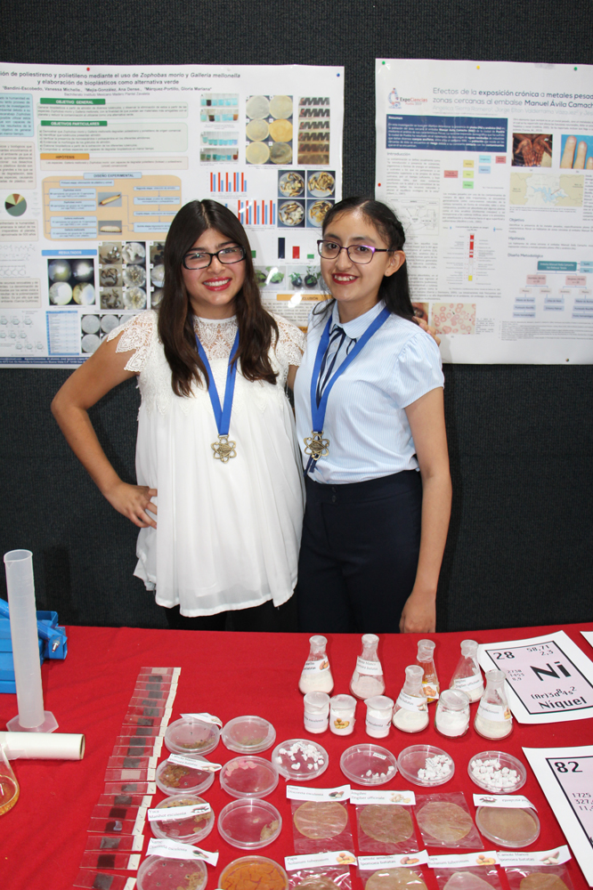 “Degradación de polietileno y poliestileno a través de gusano y mariposa y elaboración de bioplásticos”, realizado por Vanessa Michelle Bandini y Ana Denise Mejía; asesoradas por la Profa. Mariana Márquez.