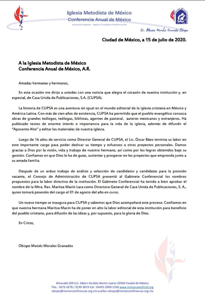 FUENTE: EEM. Cd. de México. Julio 15, 2020. El obispo Moisés Morales Granados de la CAM, anunció el nombramiento de la Mtra. Maritza Macín Lara como directora de la Editorial CUPSA, a partir del próximo 1 de agosto. Enfatizó la confianza en nuestra hermana Macín para poner “en alto la labor de esta institución para beneficio del pueblo cristiano, para difusión de las ideas y para la gloria de Dios”.