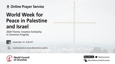 FUENTE: CMI. Ginebra, Suiza. Septiembre 11, 2020. Una oración matutina en línea organizada por el Consejo Mundial de Iglesias (CMI) el 14 de septiembre se centrará especialmente en la Semana Mundial por la Paz en Palestina e Israel, celebrada este año del 13 al 21 de septiembre.