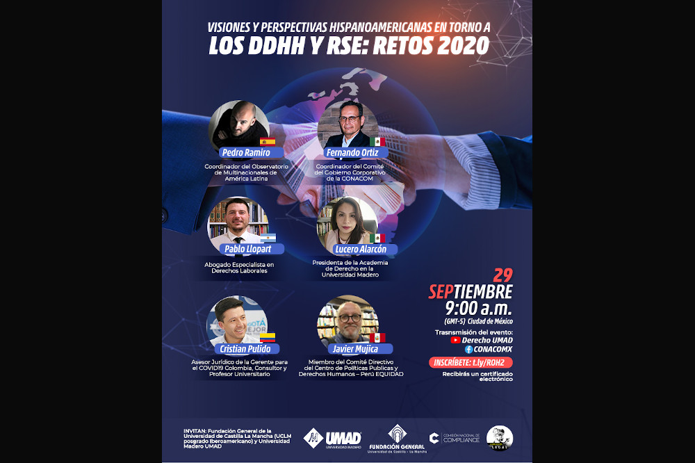 Dadas las condiciones que aún se viven derivadas de la pandemia, el panel “Visiones y perspectivas hispanoamericanas en torno a los DDHH y la RSE: retos 2020”, se llevará a cabo en línea en los siguientes canales: