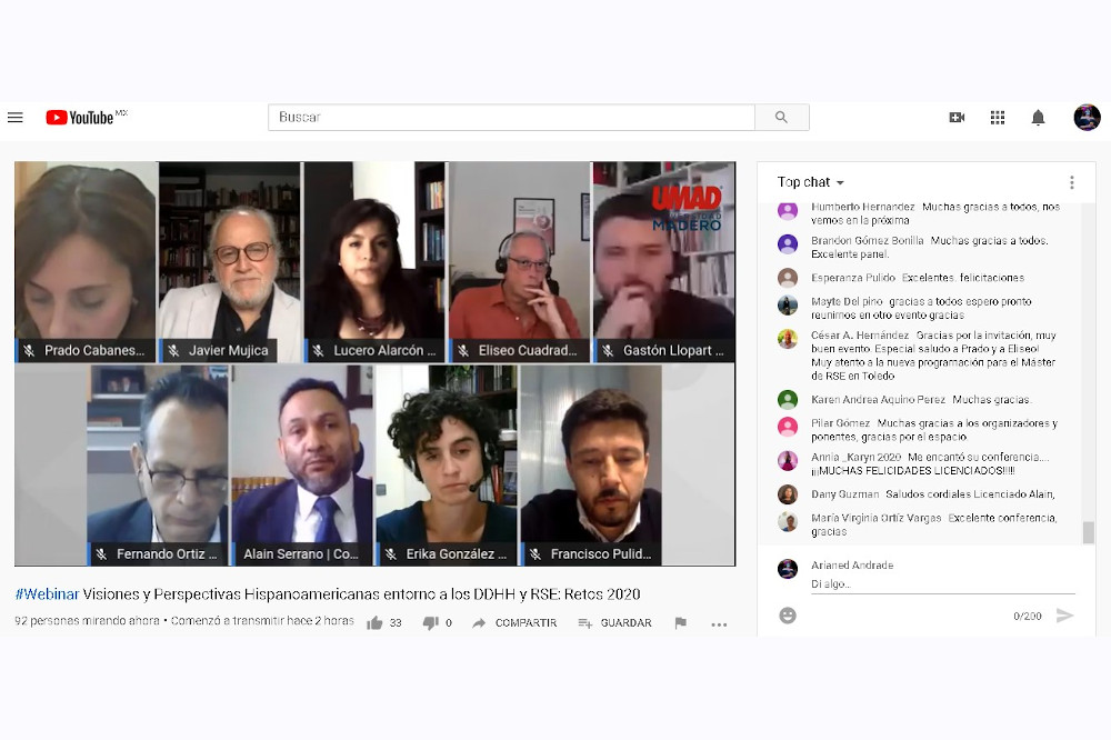 San Andrés Cholula, Puebla. La Universidad Madero UMAD (México), la Fundación General de la UCLM (España) y la Comisión Nacional de Compliance CONACOM (México) ofrecieron un panel internacional con el tema «Visiones y perspectivas hispanoamericanas en torno a los Derechos Humanos y Responsabilidad Social Empresarial: Retos 2020», a través de Facebook Live y YouTube.