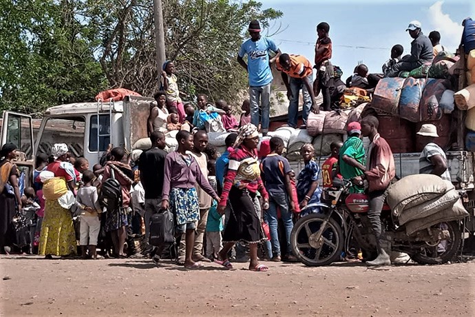 Personas desplazadas, incluidos metodistas unidos, de las aldeas de Mutwangwa y Eringeti llegan a Beni, Congo, después de huir de un ataque de los insurgentes. Veinticinco civiles, incluidos siete metodistas unidos, murieron en la masacre del 31 de diciembre. Foto de Philippe Kituka Lolonga, UM News.