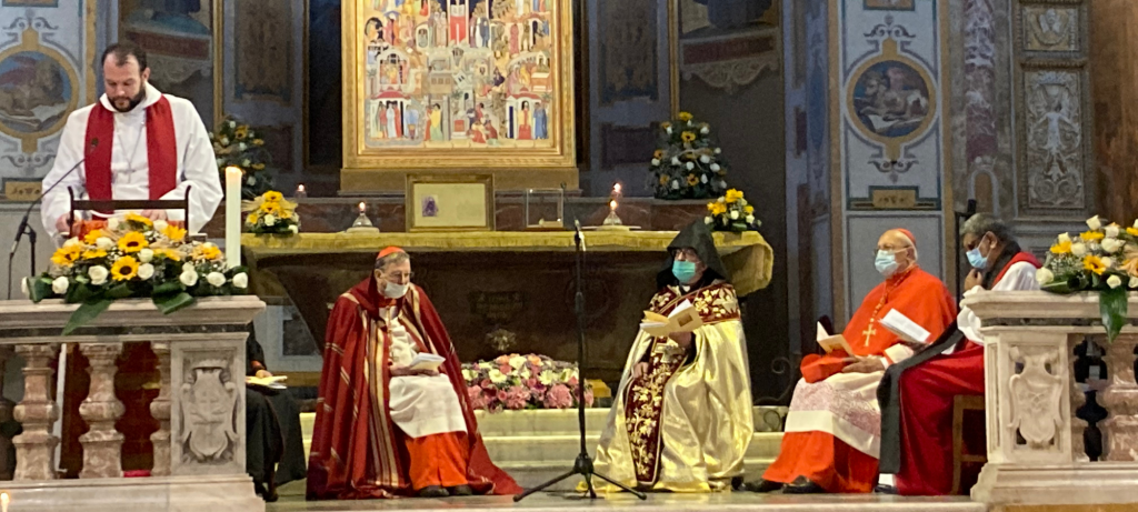 FUENTE: MEOR. Roma, Italia. Abril 26, 2021. El Rev. Matthew A. Laferty, director de la Oficina Ecuménica Metodista de Roma, participó el 25 de abril de 2021 en un servicio ecuménico de conmemoración por el 106 aniversario del Genocidio Armenio en la Basílica de San Bartolomé en la Isla (San Bartolomeo all’Isola) en Roma. La iglesia tiene un monumento especial a los mártires de la fe cristiana de los siglos XX y XXI. S.Em. El arzobispo Khajag Barsamian de la Iglesia Apostólica Armenia presidió con S.Em. Cardenal Kurt Koch del Pontificio Consejo para la Promoción de la Unidad de los Cristianos predicando el metodista Rev. Laferty leyó las Escrituras durante el servicio de la Carta a los Hebreos, basado en “porque necesitas paciencia, para que cuando hayas hecho la voluntad de Dios, puedas recibir lo prometido” (Hebreos 10:36).