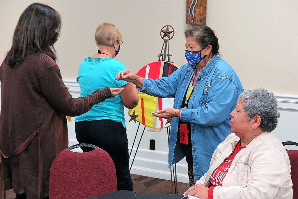 Un grupo de 40 personas pasó varios días aprendiendo sobre la historia y la cultura de los nativos americanos, así como sobre los desafíos que enfrentan las comunidades indígenas. Josephine Deere sirve la comunión a los participantes en una experiencia de inmersión celebrada por la Conferencia Misionera Indígena de Oklahoma de la Iglesia Metodista Unida. Foto de Tim Tanton, UM News.