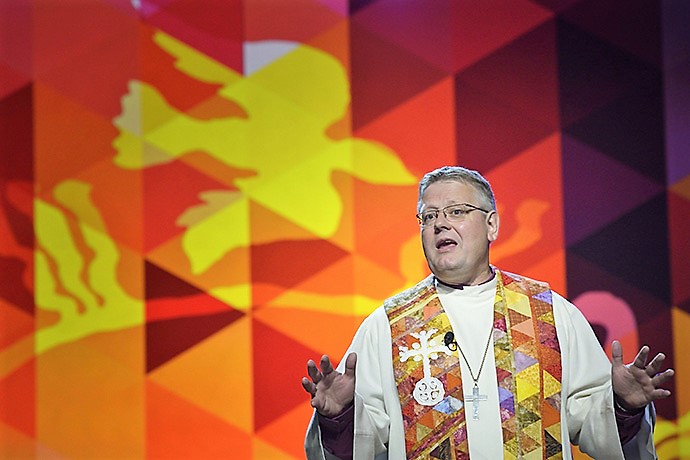 El Obispo del área nórdica-báltica, Christian Alsted, predica durante la Conferencia General Metodista Unida de 2016 en Portland, Oregón. El presidente de la Mesa Conexional dirigió el devocional de apertura durante la reunión en línea del cuerpo de liderazgo el 17 de noviembre. Foto de archivo de Paul Jeffrey, Noticias MU.
