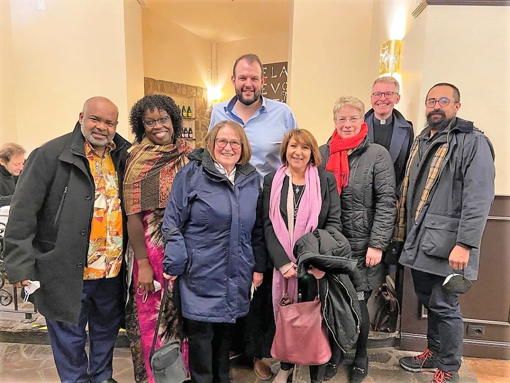 FUENTES: FB Xam Murillo, Global Christian Forum. Roma, Italia. Febrero 10, 2022. El Rev. Matthew A. Laferty, director de la Oficina Ecuménica Metodista de Roma (MEOR, por sus siglas en inglés), organizó una cena para varios líderes metodistas y amigos de MEOR que visitan Roma que están asistiendo a la reunión ampliada de liderazgo de Foro Cristiano Mundial (GCF, por sus siglas en inglés). Participaron el secretario de GCF Rev. Casely B. Essamuah (Iglesias Metodista Ghana), Dra. Angela Wakhweya Essamuah, la Secretaria de Ginebra del Consejo Mundial Metodista Obispa Rosemarie Wenner (Evangelisch-methodistische Kirche), Rev. Laferty, Rev. Mirella Mannochio (iglesias metodistas en Italia), la teóloga católica Profra. Dra. Myriam Wiljens, oficial del Vaticano para Relaciones metodistas Padre Anthony Currer,y el presidente de jóvenes y jóvenes adultos del Consejo Mundial Metodista Rev. Samuel Murillo (de la Iglesia Metodista en México).