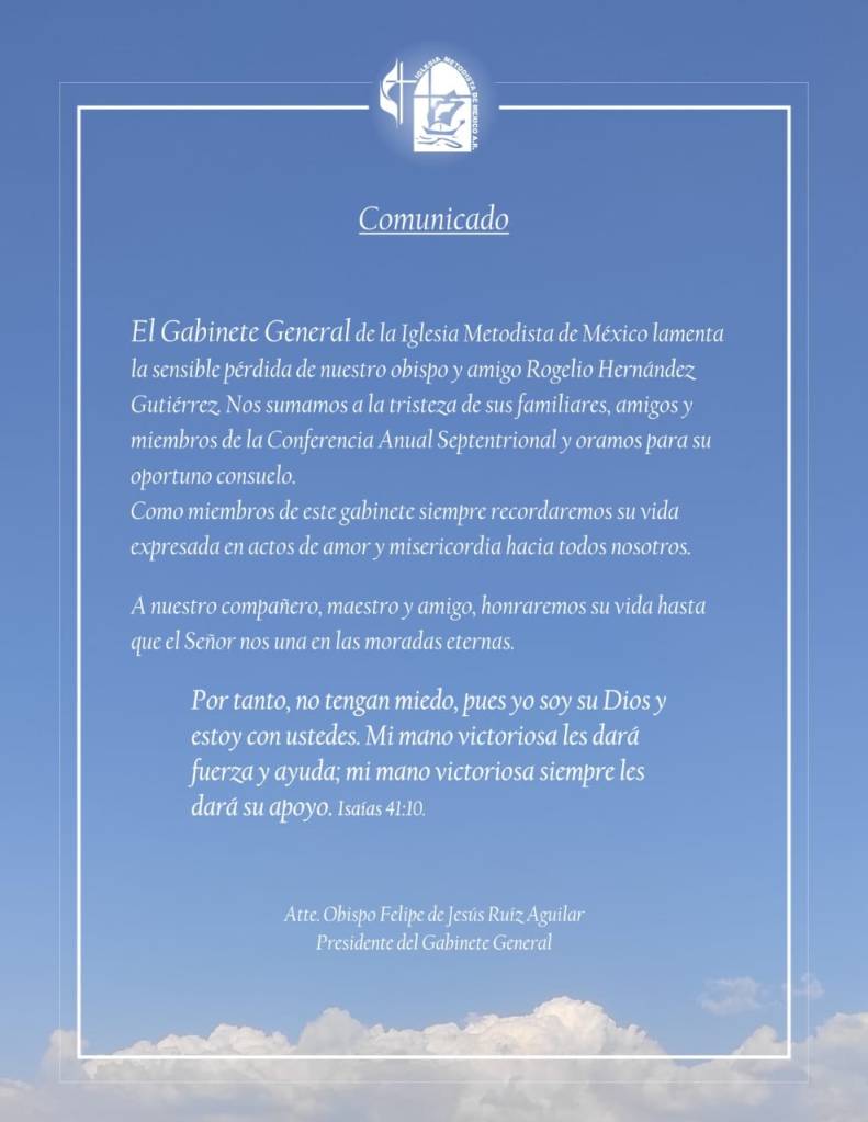 En la esperanza de la vida eterna, la Iglesia Metodista de México ha acompañado a la familia de nuestro hermano, pastor y obispo, rogando al Señor su consuelo y abrigo en estos momentos. Como familia nacional metodista, se recibieron diversas y múltiples muestras de cariño y fraternal acompañamiento.