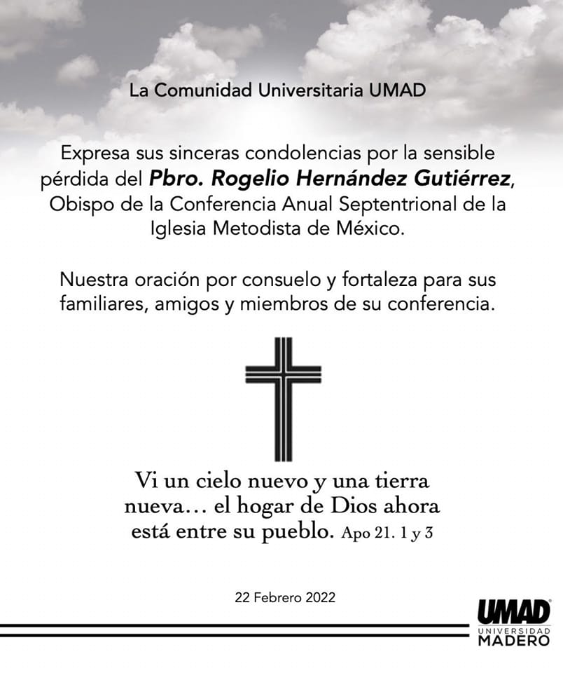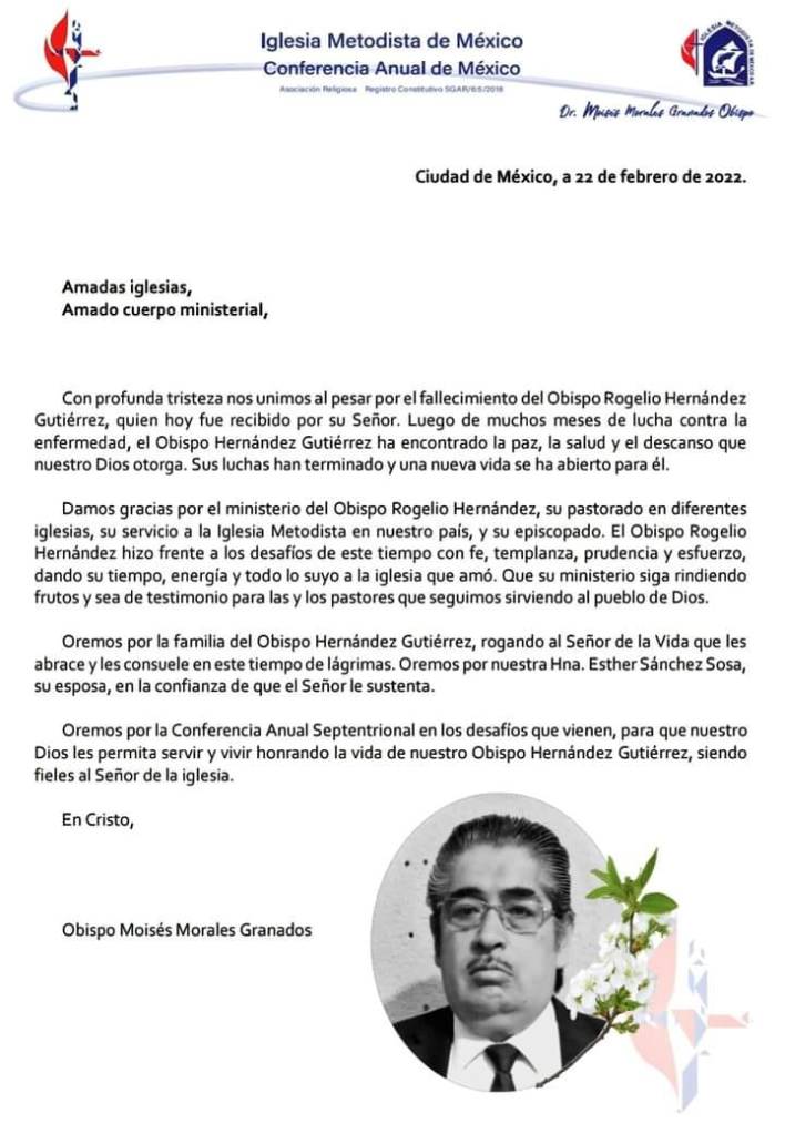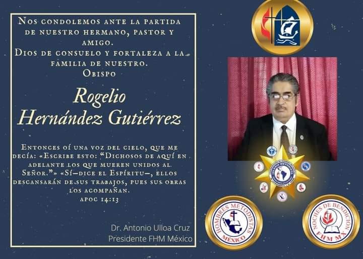 El pasado martes 22 de febrero fue llamado a la presencia de nuestro Señor el Obispo de la Iglesia Metodista de México A.R. en la Conferencia Anual Septentrional, el Pbro. Rogelio Hernández Gutiérrez. El hecho acaeció en la ciudad de Querétaro, donde el pastor Hernández se encontraba convaleciente después de varios meses en que su salud se vio quebrantada.