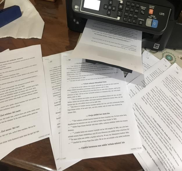 Felizmente, pude encontrarlos. Siempre con su buena disposición de continuar el trabajo hicieron su viaje hasta Pucallpa, para juntos continuar sirviendo en esta área. La última vez, pudimos poner en borrador los capítulos 5, 17 y 18 del evangelio según San Mateo, por lo que ahora nos dedicamos a las correcciones.