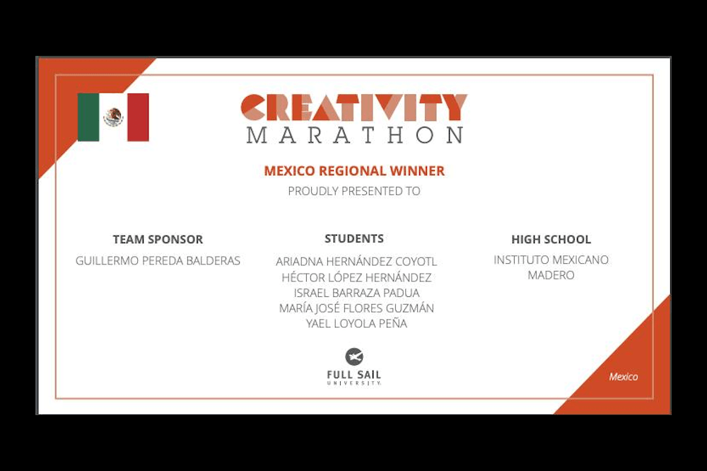 El concurso se llevó a cabo en línea a través de las redes sociales del “Creativity Marathon” de la Universidad Full Sail, y mediante la plataforma Zoom.