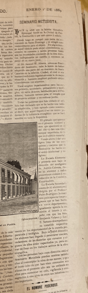 Examinar la historia de nuestra iglesia nos ayuda a asomarnos al quehacer de hermanos en la fe que nos antecedieron. Una fuente de historia la constituyen los periódicos editados por metodistas de su tiempo. Aquí les presentamos la transcripción de un escrito aparecido en el periódico El Abogado Cristiano Ilustrado, en su edición del 15 de enero de 1889, sobre el Seminario de Teología y Escuela Preparatoria de la Iglesia Metodista Episcopal en Puebla.
