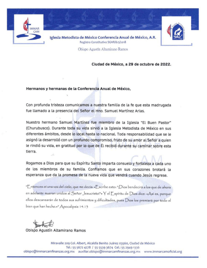 Un metodista fiel ha partido con su Señor. El hermano Samuel Martínez Arias, destacado laico de la Conferencia Anual de México, a quien personalmente conocimos por su trabajo a nivel nacional durante la Conferencia General de Metepec, Puebla, en 1990, fue llamado a la presencia del Padre el 29 de octubre pasado. Con respeto para él y su familia, oramos por la fortaleza y consuelo que sólo el Espíritu Santo puede dar. Aquí reproducimos el comunicado emitido por el Obispo de esa Conferencia, Pbro. Agustín Altamirano Ramos.