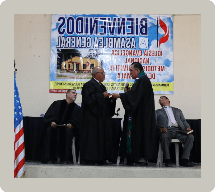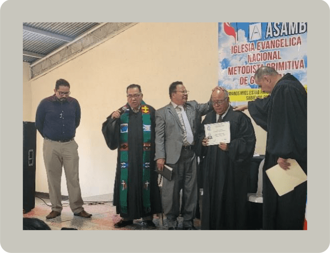 Estuvimos en el presídium el presidente del comité ejecutivo de la IENMPG, pastor Tomás Riquiac Ixtan; el Representante Regional para América Latina y el Caribe de la Junta General de Ministerios Globales de la IMU, Reverendo Edgar Avitia Legarda, con quien tenemos el convenio del Bachillerato en Estudios Metodistas; el pastor Germán Ramirez López, nuestro alumno a graduar; y su servidor como Director del Seminario Dr. Gonzalo Báez Camargo.