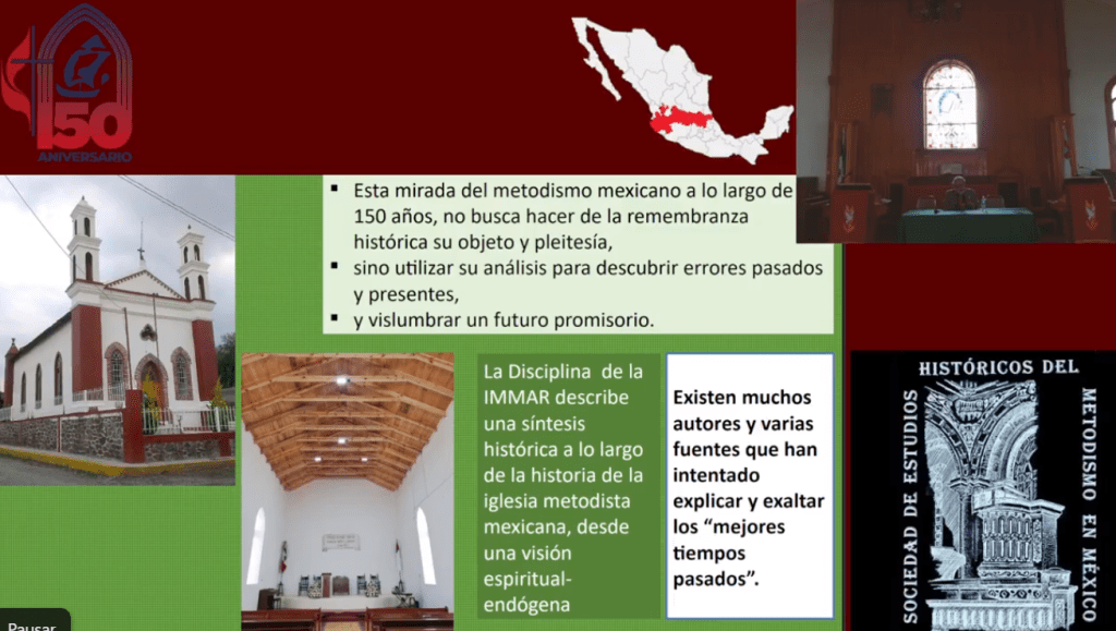 El Mtro. García Escorza nos compartió las etapas iniciales del metodismo en nuestro país, con incursiones inglesas en Pachuca y Mineral del Monte, a través de los trabajadores de la minería. desde 1826 y que, sin embargo, fueron posibles por los permisos especiales que otorgaron las autoridades civiles de la época a aquellos para profesar su credo de forma privada, ya que las leyes de México prohibían el ejercicio de cualquier otra religión fuera de la católica-romana, especialmente por lo establecido en la Constitución de la República de 1824, las leyes constitucionales de 1836 que suprimieron el régimen federal y que constituyeron un estado confesional, así como por la propia Constitución de 1824, reestablecida su vigencia en 1846.