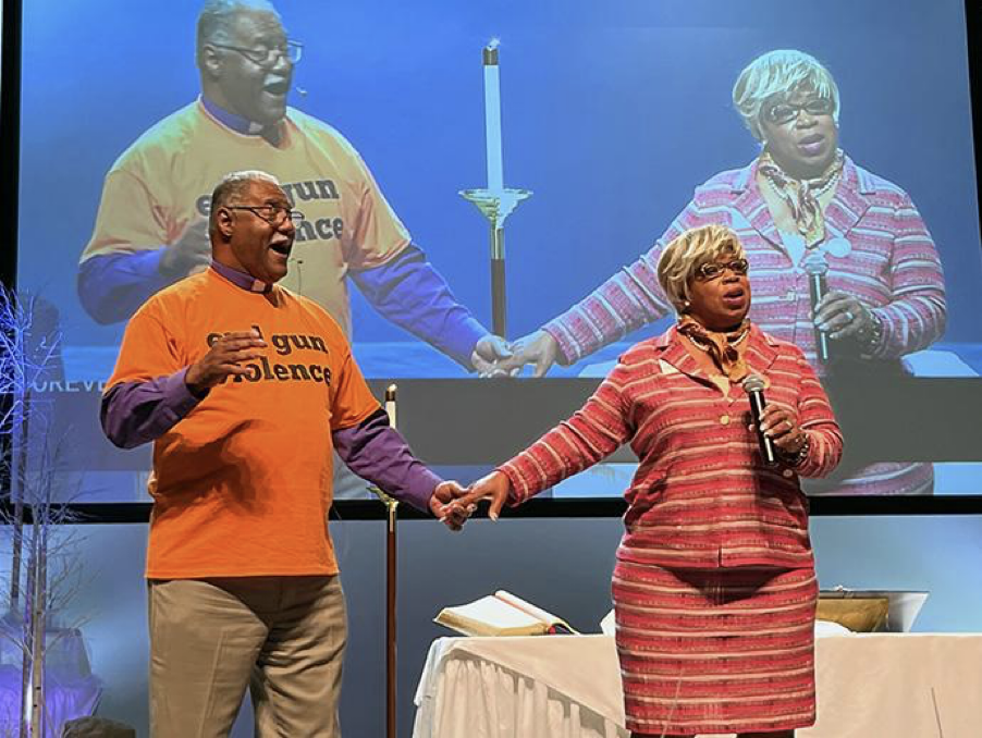El obispo Julius C. Trimble y la primera dama Racelder Grandberry-Trimble dan un comienzo inspirador a la sesión de la Conferencia Anual de Indiana mientras comparten su camino de fe. La conferencia se centró en el futuro con el tema “Orar hacia adelante: sin vuelta atrás” en su reunión del 8 al 10 de junio en Muncie, Indiana. Foto de Tim Tanton, UM News.