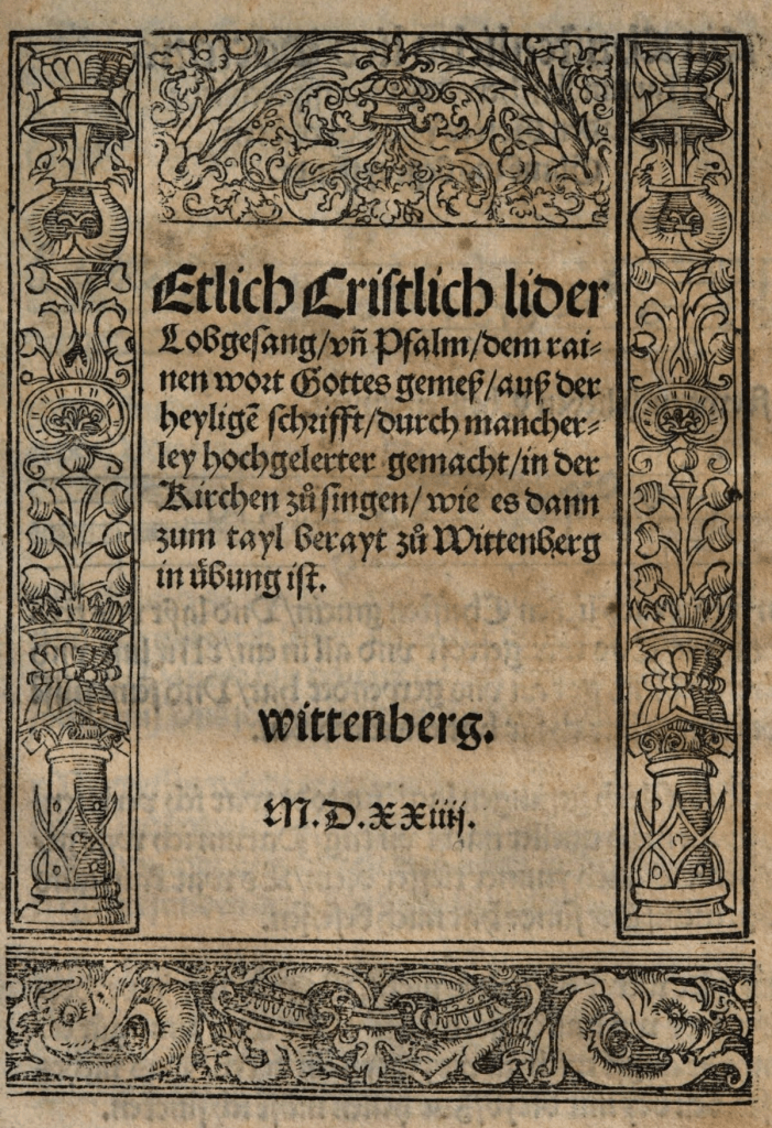 El himnario fue escrito por Martín Lutero y Pablo Speratus. Contiene ocho himnos: cuatro compuestos por Lutero, tres por Speratus y uno anónimo, que ha sido atribuido a Justo Jonas. Los creadores declararon su intención en la portada: Cánticos y salmos/ de acuerdo con la pura palabra de Dios/ de las Santas Escrituras/ realizado por varias doctas personas/ para ser cantados en la iglesia/ tal como ya se practica en parte en Wittenberg.