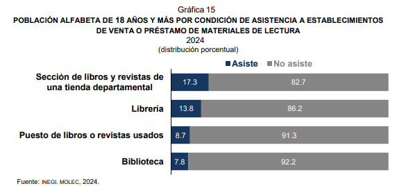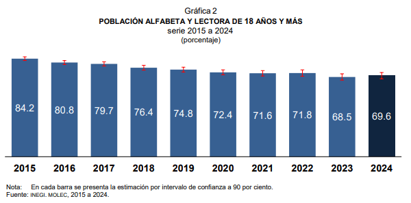 Por medio de un cuestionario conocido como Módulo sobre Lectura (MOLEC) el INEGI dio a conocer que para este 2024 solamente un 69.6% de la población alfabeta de 18 años y más, declaró haber leído ya sea un libro, revista, periódico foros o blogs en internet; cifra que al ser comparada con el 84.2% del 2015, año en el que se realizó por primera vez la medición con este método, resulta alarmante tras una disminución de 14.6 puntos porcentuales.