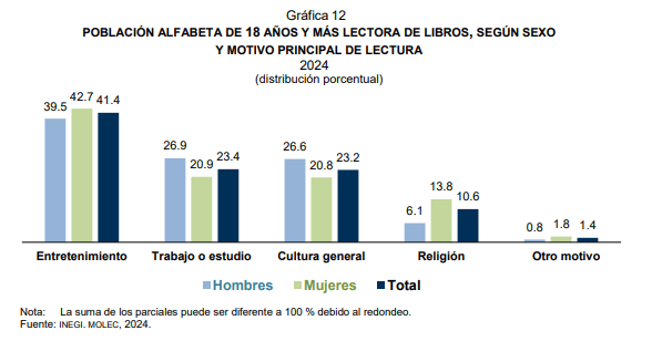 Y es que entre los resultados que aportó el INEGI hay otro dato que es todavía más alarmante. Tras darse a conocer los motivos por los cuales el mexicano lee, se puede ver que las lecturas por motivos religiosos se encuentran en el cuarto puesto, con apenas un 10.6%, de la población lectora, mientras que el tercero le corresponde a la lectura por cultura general con un 23.2%, le sigue un 23.4% que lee por motivos de estudio o trabajo y en el primer puesto aparece la lectura por entretenimiento con un 41.4%.