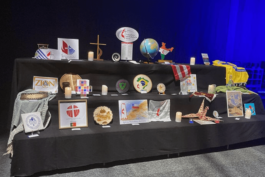 Mientras la banda de adoración tocaba una versión instrumental de la festiva “Tarde en la Noche” de Paul Simon, ella y otros/as representantes denominacionales que estaban en el escenario dieron un paso al frente para presentar sus símbolos. Muchos/as de los/as representantes vistieron trajes tradicionales para resaltar su país de origen. Los/as fieles aplaudieron a cada miembro de la familia metodista.
