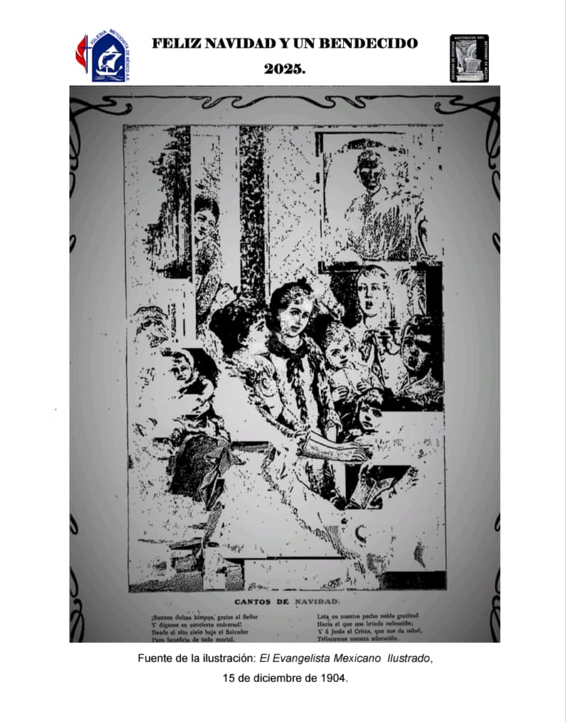 La foto fue tomada de la edición del 15 de diciembre de 1904 de El Evangelista Mexicano, y se refiere a una imágen en donde la familia (madres, niños y jóvenes), se reúnen en la sala a entonar acompañados del piano villancicos navideños. En este caso, la publicación incluye un fragmento del himno titulado «Suenen Dulces Himnos».