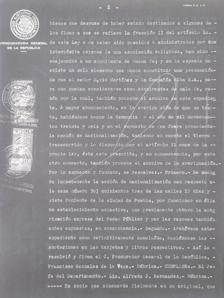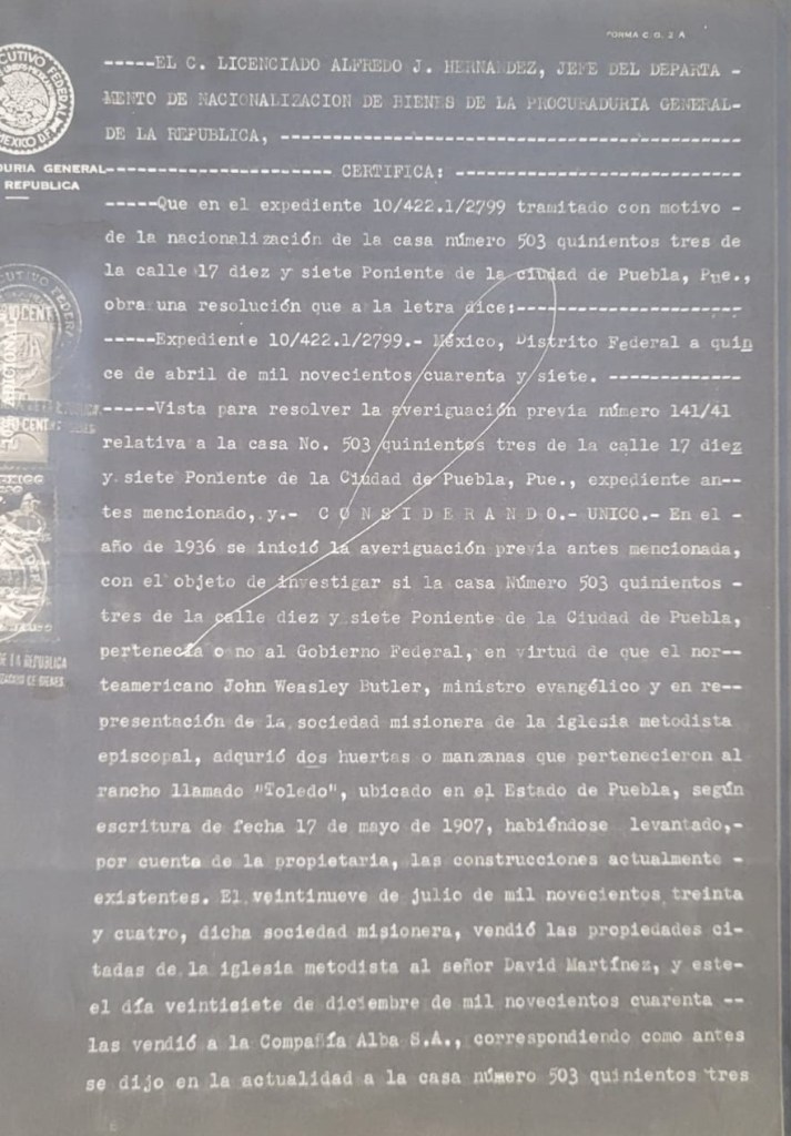 La historia es larga, y los documentos existentes en el Archivo Nacional de nuestra Iglesia narran con detalle todo el proceso que siguió a los actos intimidatorios y proceso de nacionalización, para que 11 años después, con fecha 23 de abril de 1947, y bajo el expediente 10/422.1/2799 se resolviera: “PRIMERO. Se declara improcedente la acción de nacionalización de la casa 503 de la 17 poniente, Puebla, Pue. SEGUNDO. Archívese este expediente como definitivamente concluido, haciéndose las anotaciones correspondientes en las tarjetas y libros respectivos”.