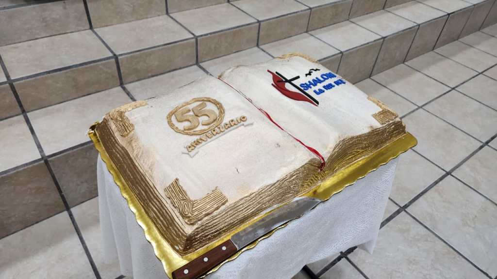 El evento concluyó en un ambiente de alegría y comunión fraternal, compartiendo algunos bocadillos, y por supuesto el pastel emblemático, cuyo diseño fue una exquisita biblia abierta, mientras tanto, proyectaban fotos históricas que muestran el desarrollo de nuestra congregación