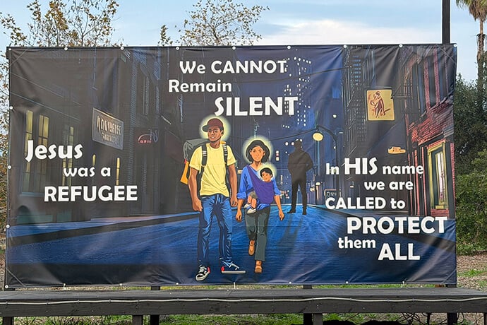 “Estamos intentando asegurarnos de que la Sagrada Familia no sea representada como blanca, sino que refleje sus orígenes de Oriente Medio. Una figura en silueta al fondo representa a un agente del ICE que persigue y vigila a la Sagrada Familia en su vida cotidiana” dijo Campbell.