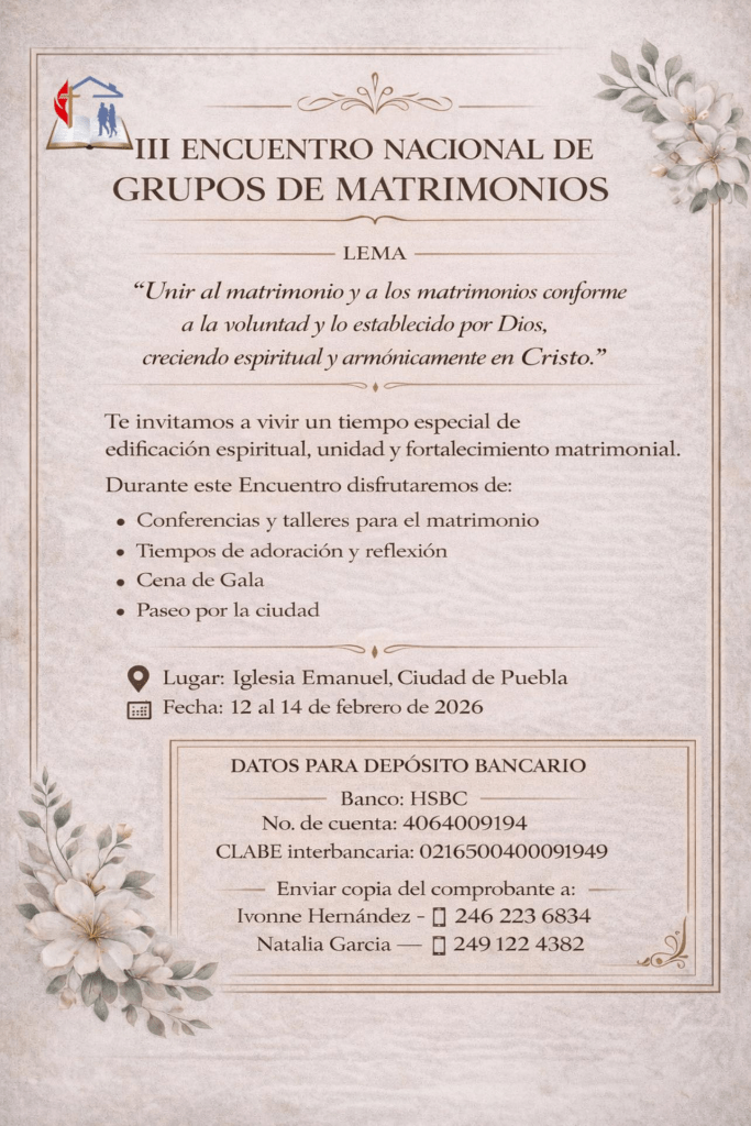 El III Encuentro Nacional de Grupos de Matrimonios se realizará del 12 al 14 de febrero próximo en la Iglesia Emmanuel de la ciudad de Puebla. Será la última reunión del cuadrienio 2022-2026.