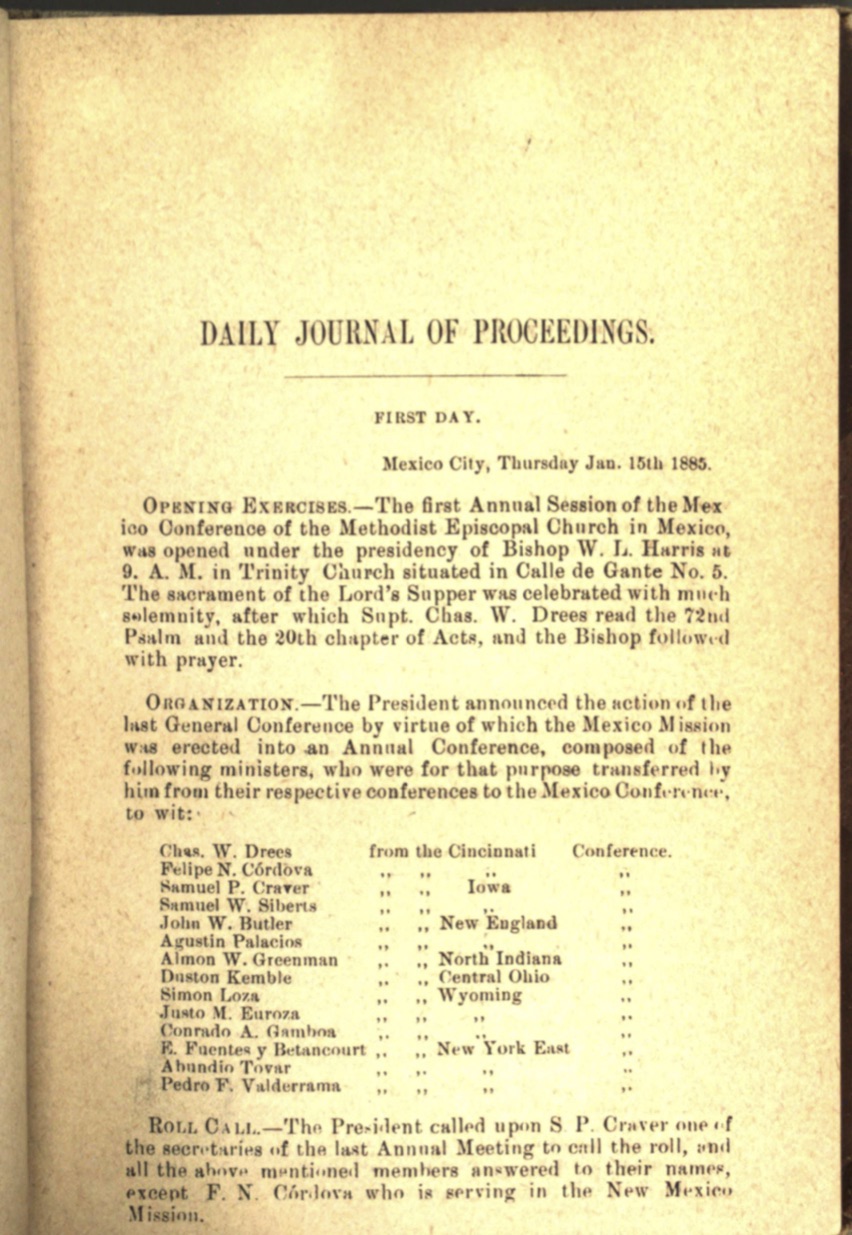 Ella nos enviará sistemáticamente documentos de extraordinario valor histórico desde ese archivo de la IMMAR para que podamos conocer datos y pensamientos del metodismo mexicano en épocas pasadas. En esta ocasión estamos publicando la primera acta de la primera Conferencia Anual de la Iglesia Metodista Episcopal, celebrada en el templo de Gante No. 5, en el mes de enero de 1884.