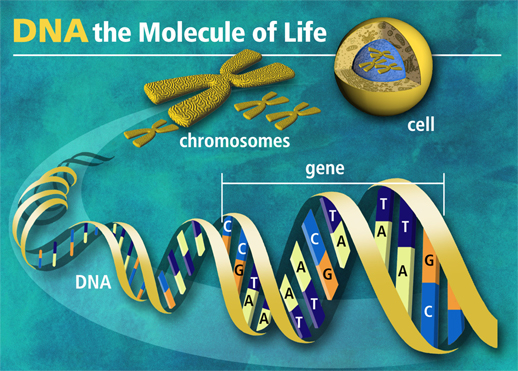 Toda la información necesaria, equivalente a unos 500 libros enciclopédicos, está detalladamente codificada en el ADN (ácido desoxirribonucleico) del núcleo celular, mediante un lenguaje especial, escrito en dos renglones paralelos, y con una infinidad de combinaciones de sus únicas cuatro letras o nucleótidos (A,T,G,C), que son comunes a todas las especies.