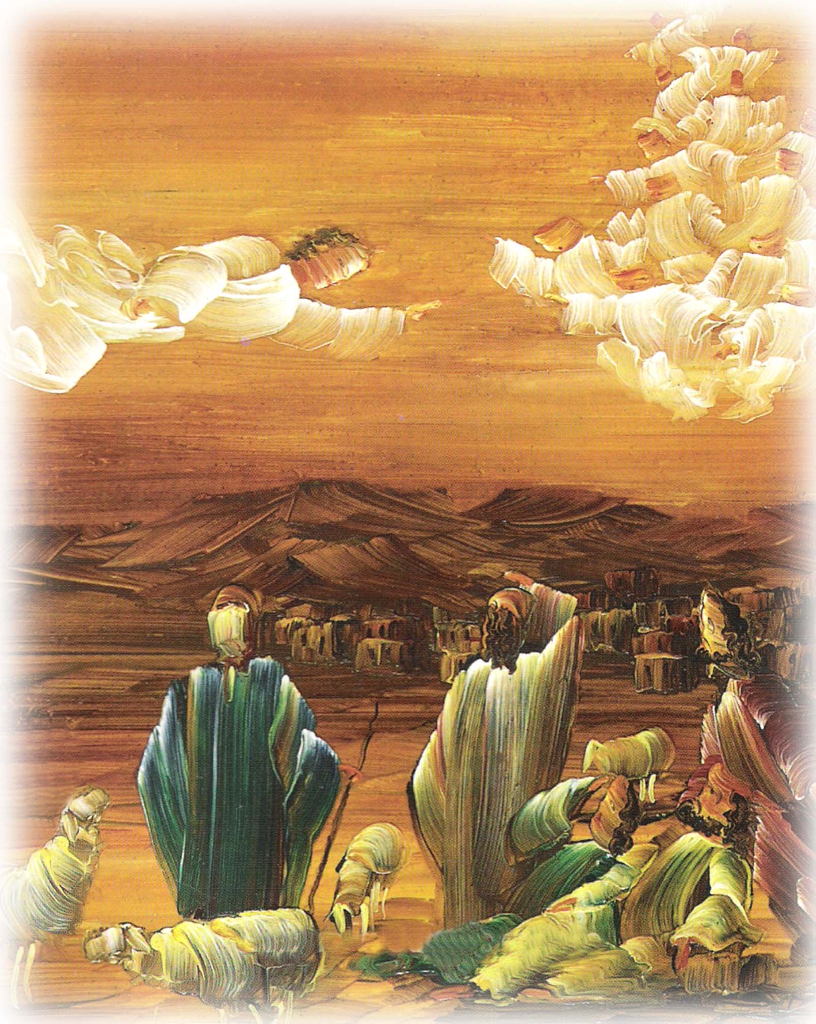 Belén-Ephrata, Palestina. 4 Tevet, 3756.- Zaki Baboun, residente en Palestina, creó esta pintura que llamó “El cántico de los ángeles” después de haber oído el testimonio de los pastores entrevistados que velaban las vigilias de la noche sobre su ganado.