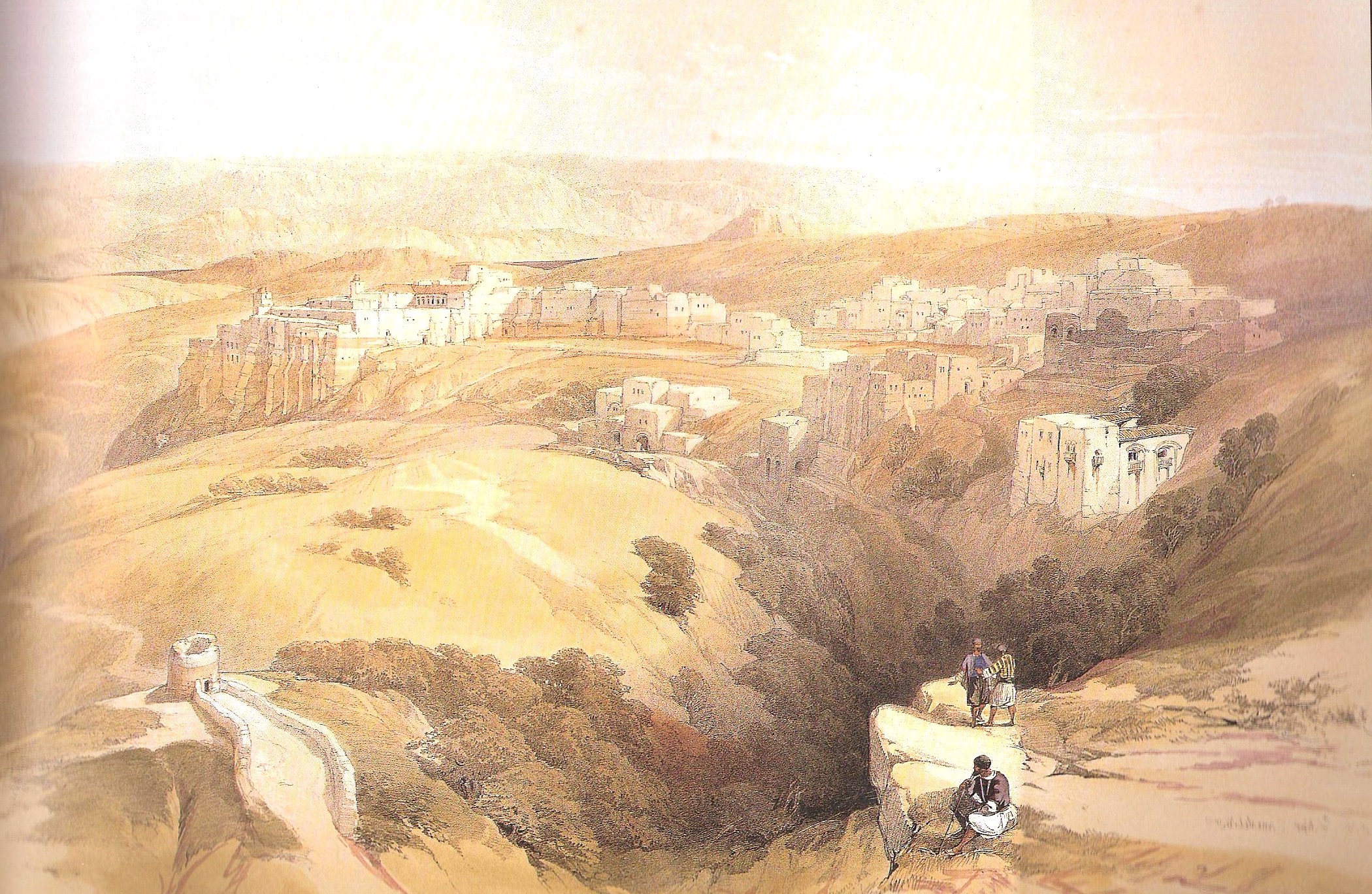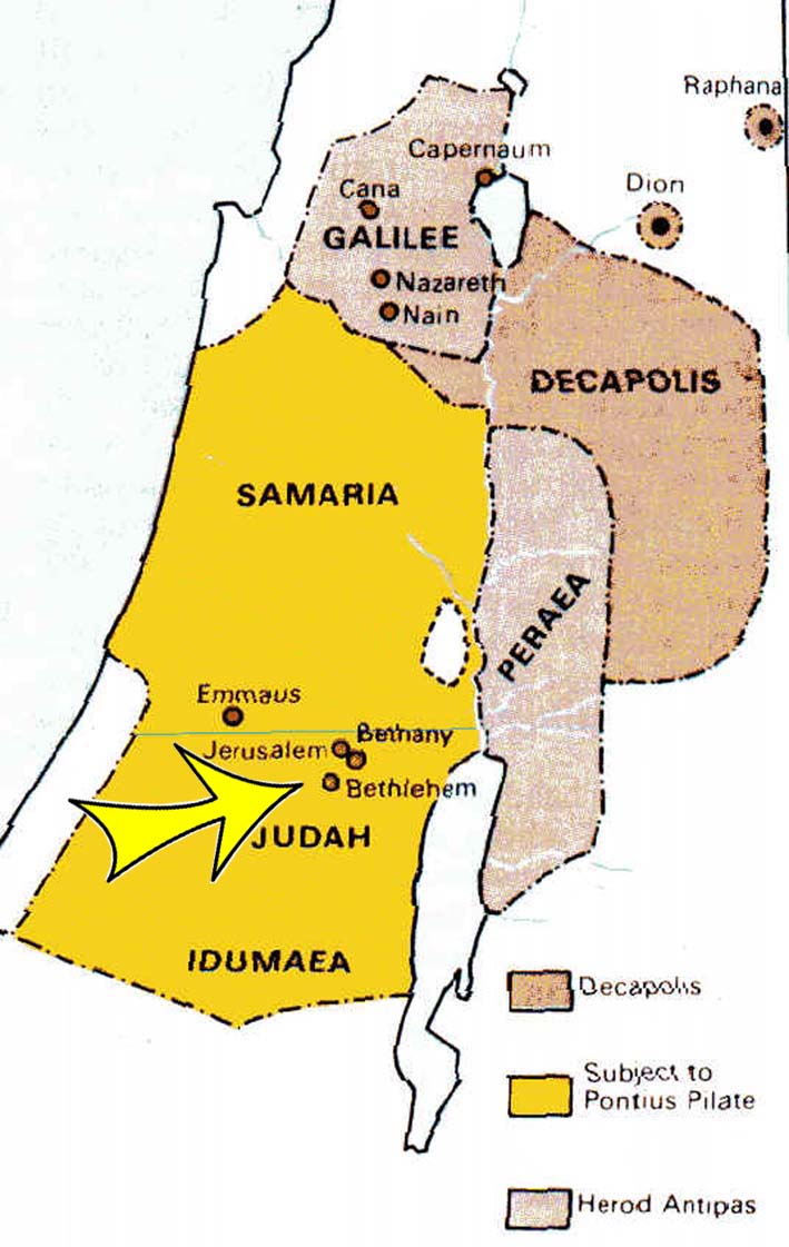 4.- Hay varias de las más importantes ciudades de Palestina: Jerusalem, a corta distancia hacia el oriente del centro latitudinal de Judea. Al oriente está el Valle de Cedrón, mientras por el poniente y el sur corre el Valle de Hinnom o Gehenna. Seis millas al sur de Jerusalén se halla Bethlenm, apenas una aldea, lugar del nacimiento que nos ocupa. A dos millas al oriente de Jerusalén está el pueblo de Bethania. También, a quince millas al noreste de Jerusalén se alza la ciudad de Jericó. En la vecindad de Capernaum esta Bethsaida y Corazín.