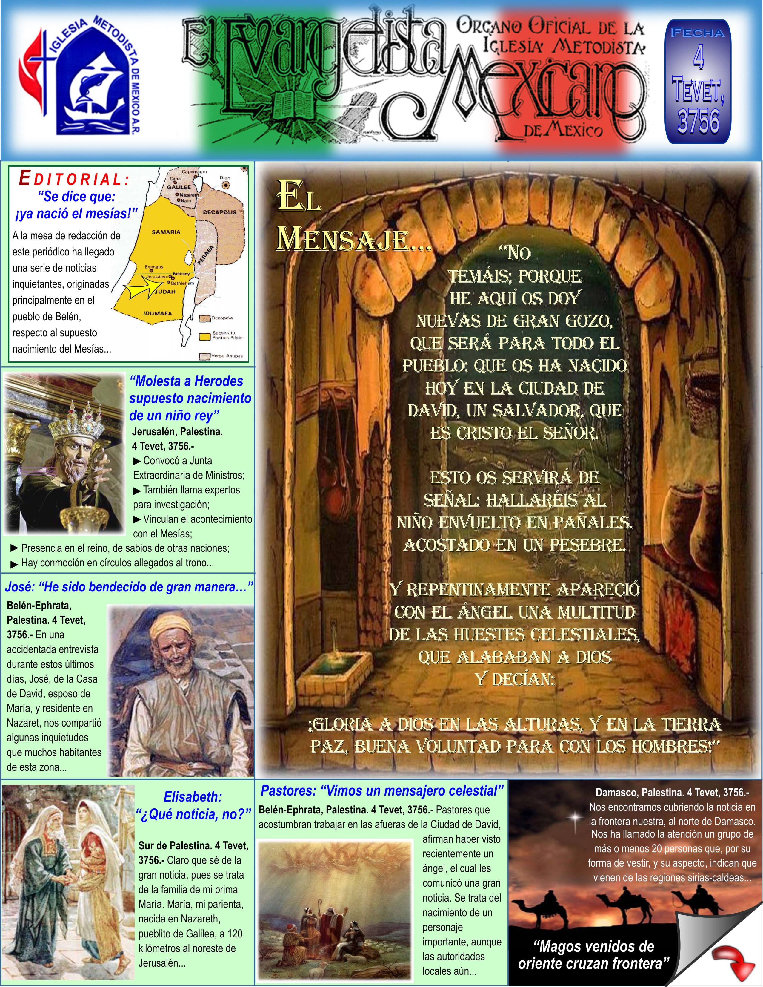 Belén-Ephrata, Palestina. 4 Tevet, 3756.- Pastores que acostumbran trabajar en las afueras de la Ciudad de David, afirman haber visto recientemente un ángel, el cual les comunicó una gran noticia. Se trata del nacimiento de un personaje importante, aunque las autoridades locales aún no expresan opinión oficial alguna al respecto. Ha llegado a nuestros oídos que se le ha llamado “Salvador”, denominación pronunciada por aquel mensajero inesperado, según dijeron los entrevistados.