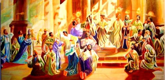 “Cuando llegó el día de Pentecostés, estaban todos unánimes juntos. Y de repente vino del cielo un estruendo como de un viento recio que soplaba, el cual llenó toda la casa donde estaban sentados; y se les aparecieron lenguas repartidas, como de fuego, asentándose sobre cada uno de ellos.
