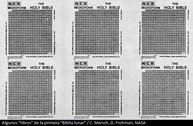 Luego estaba el problema del tamaño. La Biblia del Rey Jacobo era un tocho de más de 1.200 páginas y 773.746 palabras. Era imposible llevar siquiera unas pocas. Por eso las biblias que llegaron a la Luna podían sostenerse en la yema de un dedo. Eran pequeños cuadrados que llevaban las páginas de la biblia microfilmadas. Stout las había encargado a una empresa especializada. Para leer el Génesis o cualquier otro libro, hacía falta una lente de gran aumento.